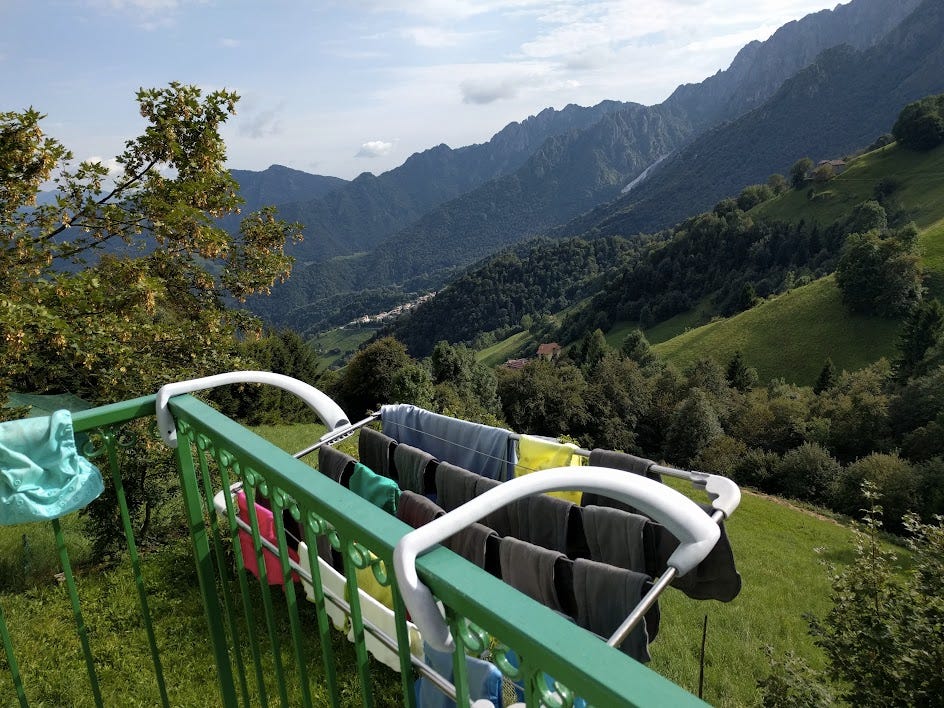 Clothes smell better when dried outdoors. Hang drying our daughter’s diapers outside in Italy.