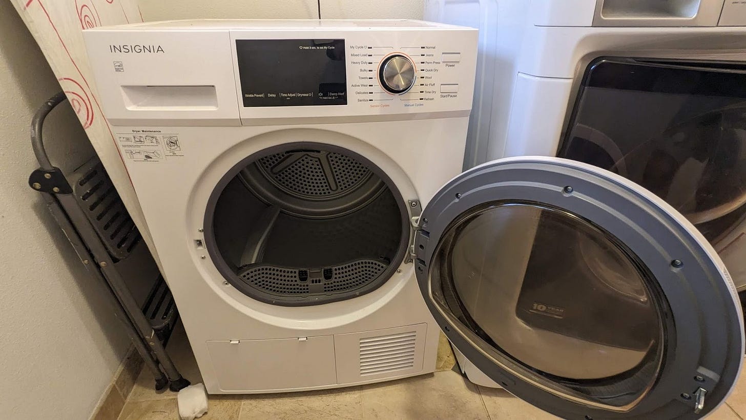 But, hang drying is not for everyone or every season, and our family wanted to get an efficient dryer to use in the winter. In 2022, we researched and then bought an Insignia (Best Buy’s Brand) heat pump dryer for our main house, replacing the ancient, 20-year old, energy hogging dryer that had come with our house when we bought it. After doing a lot of research (and writing an article about it), we saw that in 2022, nearly all heat pump dryers were “compact.” This means they had smaller drums, around 4 cubic feet of capacity (“typical” American dryers have around 7 feet of capacity). Three years ago, the Insignia cost $800 (today it costs $700), more than standard, energy hogging, electric dryers that cost $400-600 on average. But buying a compact heat pump dryer was still an upgrade for us. For one, we got to patch the hole in our house and remove the lint-filled dryer vent (heat pump dryers don’t need one). Say goodbye to cleaning vents and fire hazards! It also allowed us to use the dryer pretty guilt-free because it is so darn efficient, using only 300 to 400 watts of energy an hour and half a kilowatt hour per load (a standard electric dryer will use 3-4 kWh). The only negative parts about this dryer, which we still have and use, are that we have to divide big loads into two (because it has a smaller drum) and that it can sometimes take a long time to dry, between 75 and 120 minutes depending on the size of the load.